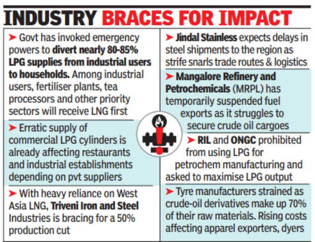 MUMBAI/CHENNAI: Shockwaves from US and Israeli strikes on Iran may seem distant from India’s shores, but for Indian industry, the impact is already hitting home. Gas curbs, production cuts, export delays, and constantly rising operating costs are rippling through fertiliser plants, ceramic kilns, sanitary ware units, textile mills, and tyre factories. In Gujarat, Triveni Iron and Steel Industries is bracing for a 50% production cut, as its heavy reliance on West Asian liquefied natural gas (LNG) leaves it exposed to supply disruptions. Jindal Stainless expects delays in steel shipments as the conflict snarls trade routes and logistics. Mangalore Refinery and Petrochemicals (MRPL) has temporarily suspended fuel exports while struggling to secure crude oil cargoes amid rising uncertainty. Industry executives warn that tensions in major oiland gas-producing regions can quickly disrupt global energy supply chains. MS Banani, joint managing director of Axiom Gas Engineering, recalls that similar disruptions during the Iraq war drove crude prices to nearly $140 a barrel, triggering sharp increases in LNG, LPG, petrol, and diesel. The current conflict involving Iran, Israel, and the US is again placing pressure on Gulf supply routes, creating procurement challenges, delays, and rising costs for Indian importers, Banani said.